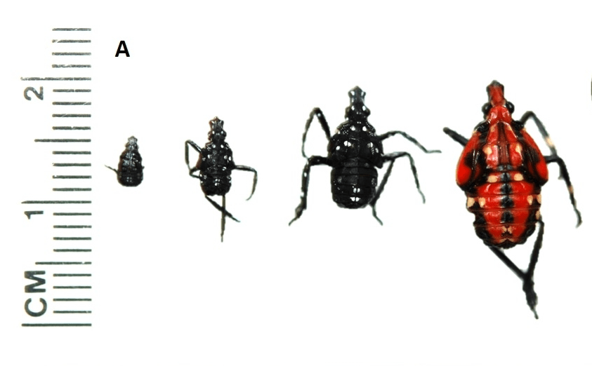 - Nymphs: Black with white spots in early stages, turning red with black and white spots as they mature.